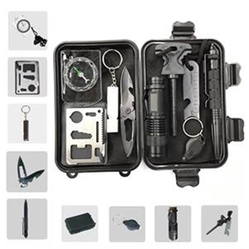 3.All in One Multi Survival Tool Kit: 13 in 1 Emergency Survival Kit contains: Upgrade survival knife, Pocket bellow, Wire saw, Water Bottle Clip, Emergency Blanket, Flint stone Scraper, Flashlight, Credit Card Knife, Multi-use Spoon Fork, Carabiner, and Waterproof Box. It is the cool gadgets for men. Pls check inventory