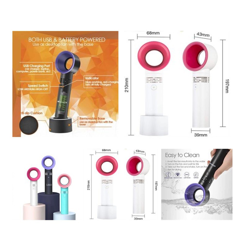 Come and Check Our Branding Solutions.Mini Handheld Bladeless Fan Air Cooler USB Rechargeable Ventilator With LED Ligth Portable Fan Outdoor/Office Supplies. Fashion mini shape design, easy carry. USB charging, Inside rechargeable 2000 mAh lithum battery, Charging time 3 hours, Keep Working 5 hours. 7 colors auto change on the base, It looks cool and attractive on the night, Helps you sleep. 3 levels working mode : Low Midium High, Bladeless Fan design, Solve the hidden danger of children's safety. Print your logo and order today. Pls check inventory and detailed info before placing your orders.