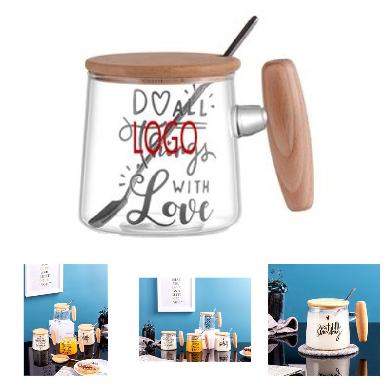 10OZ Wooden Handle Glass Creative Water Cup with Lid Spoon